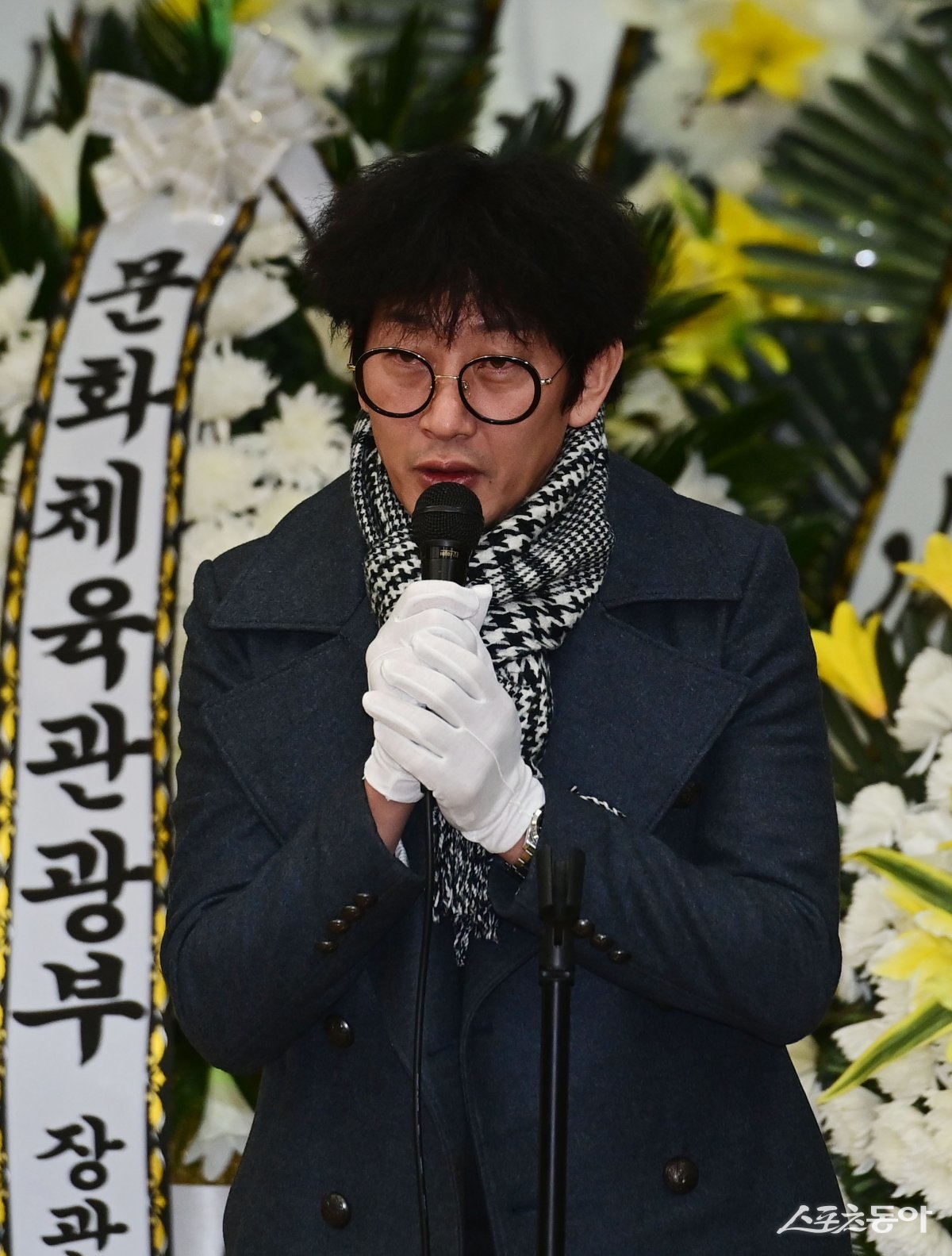 고 송대관의 영결식이 9일 서울 종로구 서울대학교병원 장례식장에서 엄수됐다. 가수 김창열이 추도사를 하고 있다. 주현희 기자 teth1147@donga.com