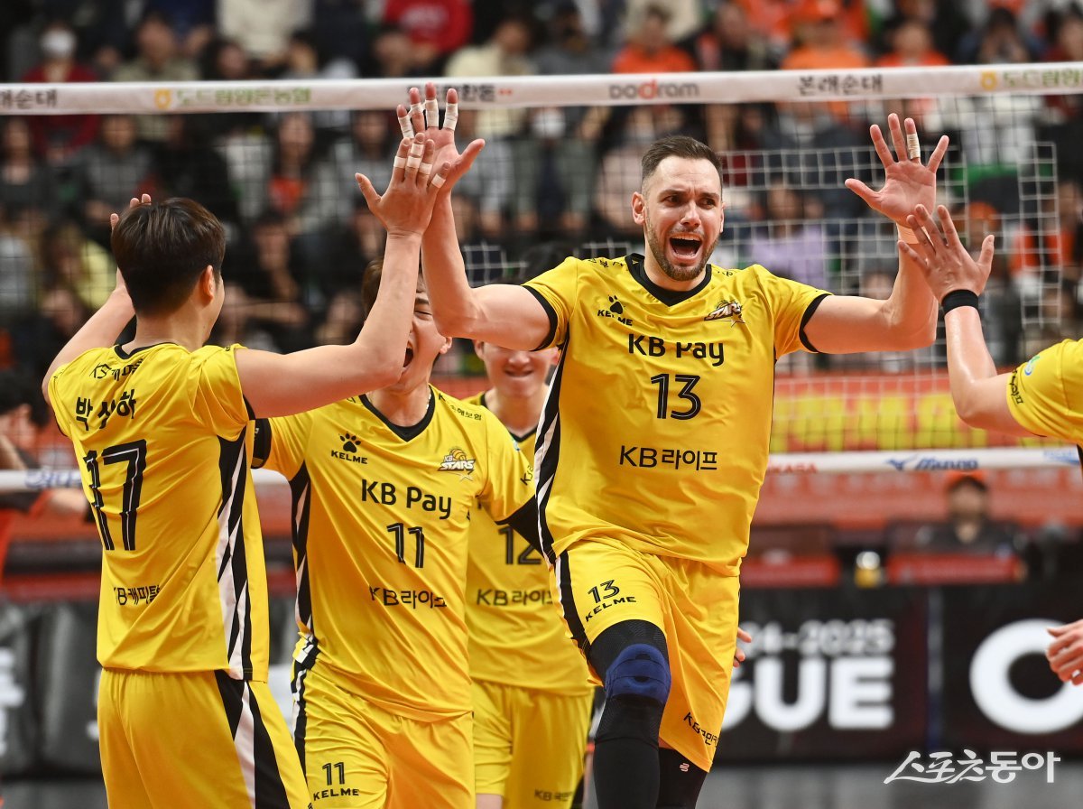 9일 안산 상록수체육관에서 열린 ‘도드람 2024~2025 V-리그’ 남자부 OK저축은행과 KB손해보험 경기에서 KB손해보험 비예나가 득점에 성공한 후 기뻐하고 있다. 안산 | 김종원 기자 won@donga.com
