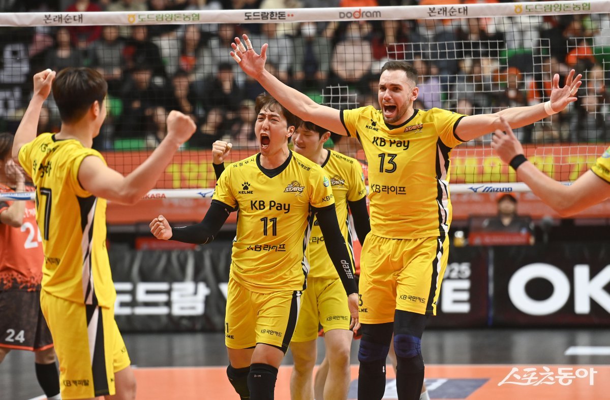9일 안산 상록수체육관에서 열린 ‘도드람 2024~2025 V-리그’ 남자부 OK저축은행과 KB손해보험 경기에서 KB손해보험 차영석이 블로킹 득점에 성공한 후 비예나와 기뻐하고 있다. 안산 | 김종원 기자 won@donga.com