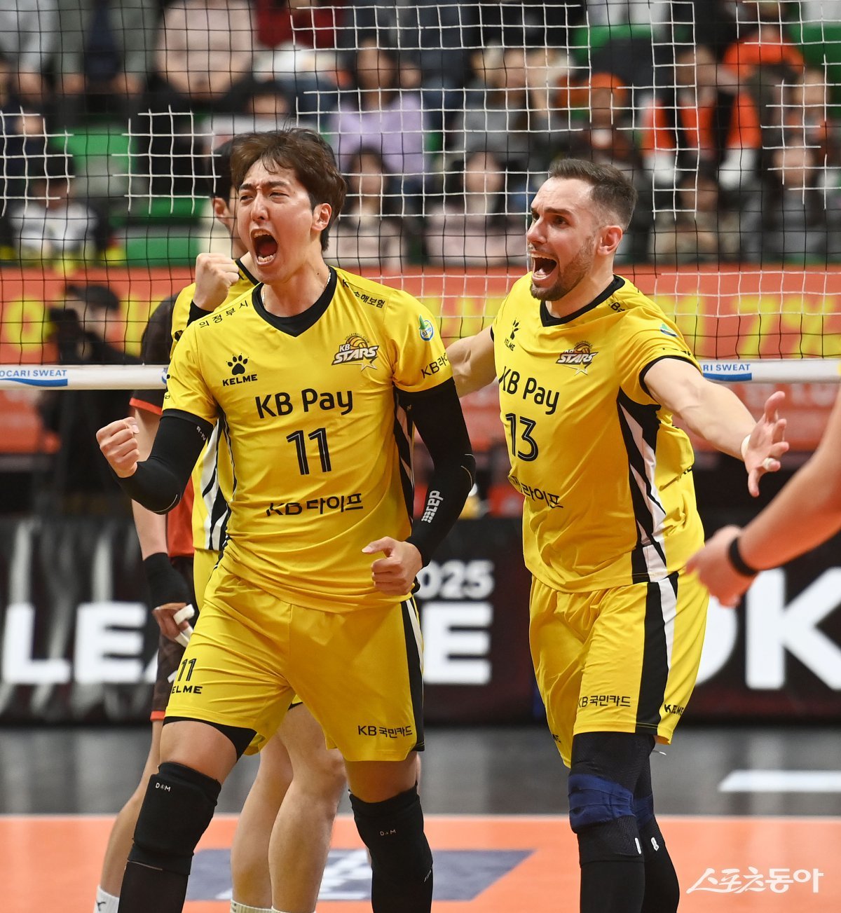 9일 안산 상록수체육관에서 열린 ‘도드람 2024~2025 V-리그’ 남자부 OK저축은행과 KB손해보험 경기에서 KB손해보험 차영석이 블로킹 득점에 성공한 후 비예나와 기뻐하고 있다. 안산 | 김종원 기자 won@donga.com