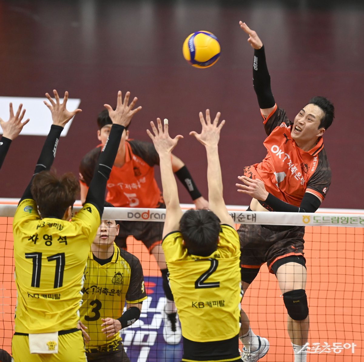 9일 안산 상록수체육관에서 열린 ‘도드람 2024~2025 V-리그’ 남자부 OK저축은행과 KB손해보험 경기에서 OK저축은행 김웅비가 KB손해보험의 블로킹 사이로 스파이크를 날리고 있다. 안산 | 김종원 기자 won@donga.com