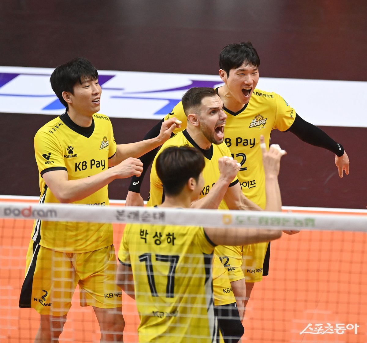 9일 안산 상록수체육관에서 열린 ‘도드람 2024~2025 V-리그’ 남자부 OK저축은행과 KB손해보험 경기에서 KB손해보험 비예나가 득점에 성공한 후 기뻐하고 있다. 안산 | 김종원 기자 won@donga.com