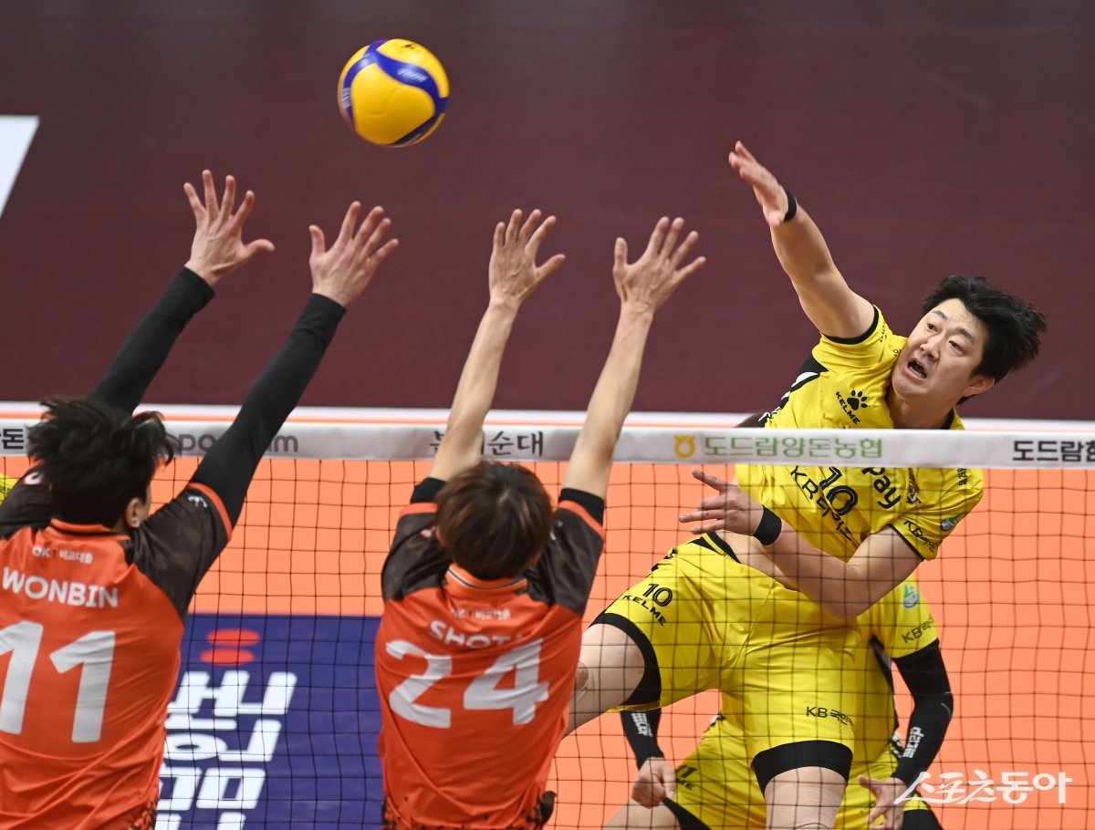 9일 안산 상록수체육관에서 열린 ‘도드람 2024~2025 V-리그’ 남자부 OK저축은행과 KB손해보험 경기에서 KB손해보험 나경복이 OK저축은행의 블로킹 사이로 스파이크를 날리고 있다. 안산 | 김종원 기자 won@donga.com