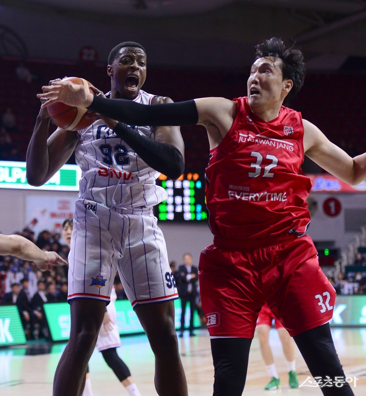 10일 안양 정관장 아레나에서 열린 ‘2024-2025 프로농구’ 정관장과 KCC 경기에서 KCC 라렌이 리바운드 볼을 잡고 있다. 안양|김종원 기자 won@donga.com