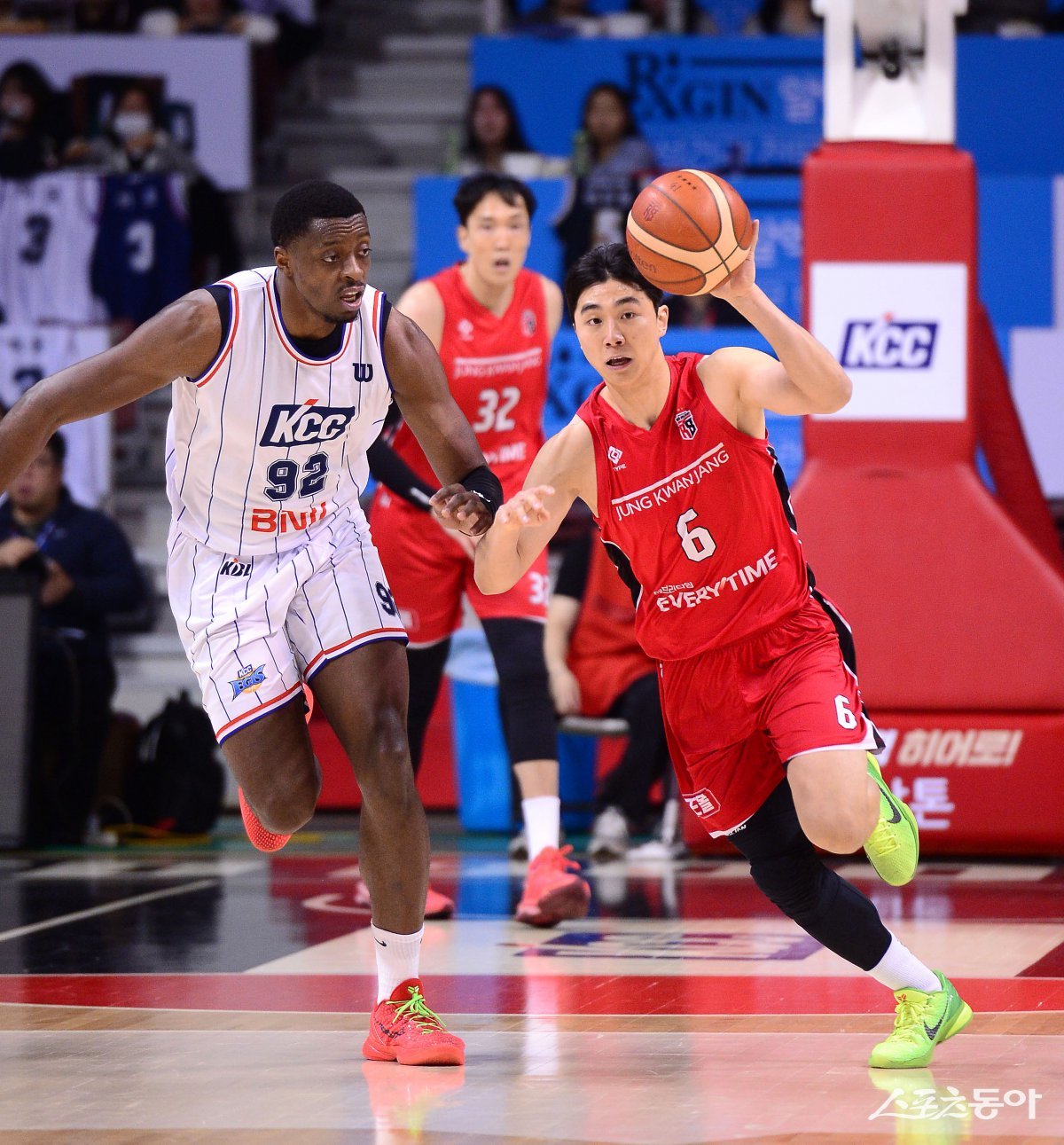 10일 안양 정관장 아레나에서 열린 ‘2024-2025 프로농구’ 정관장과 KCC 경기에서 정관장 박지훈이 속공을 펼치고 있다. 안양|김종원 기자 won@donga.com