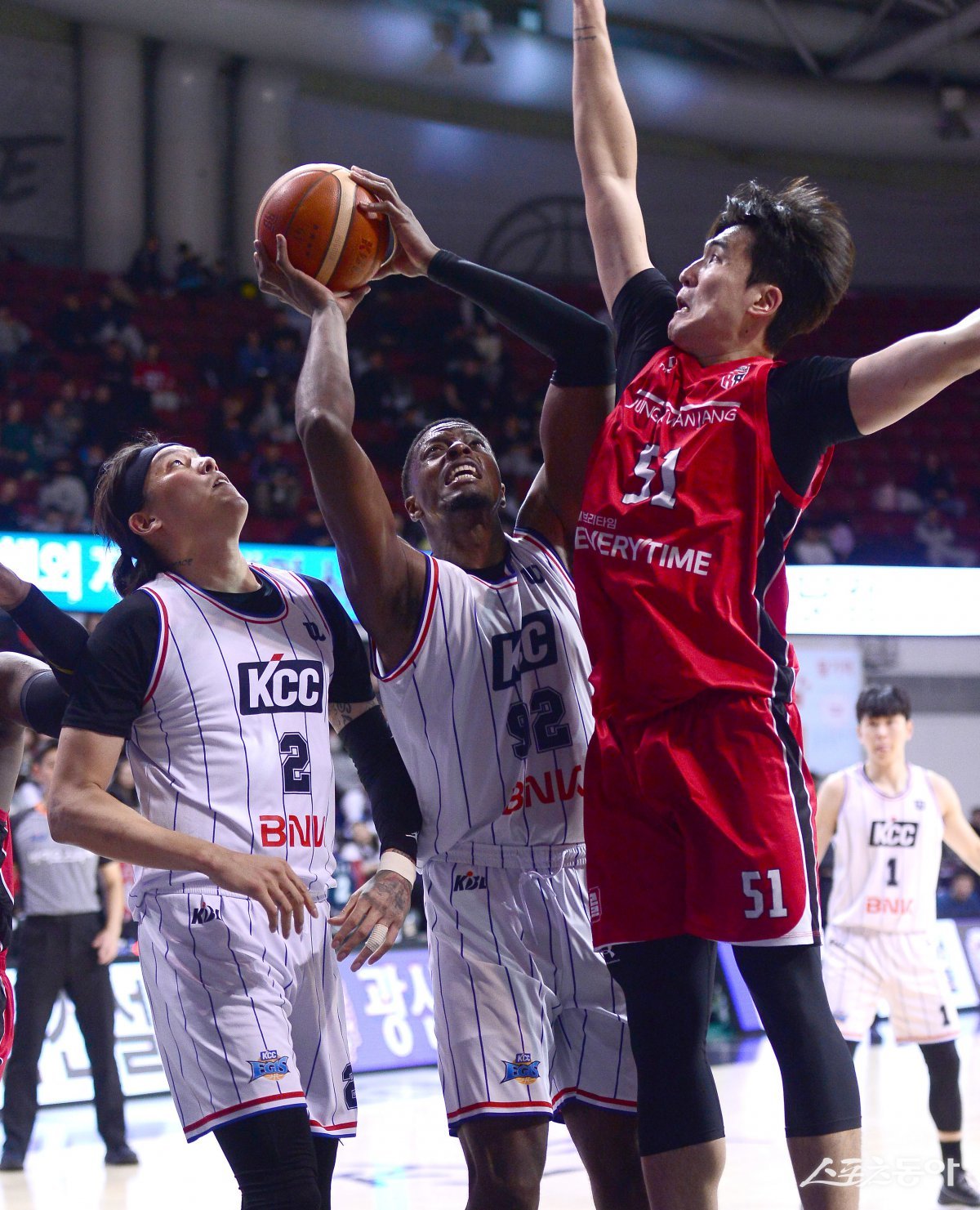 10일 안양 정관장 아레나에서 열린 ‘2024-2025 프로농구’ 정관장과 KCC 경기에서 KCC 라렌이 정관장의 수비를 뚫고 골밑 슛을 하고 있다. 안양|김종원 기자 won@donga.com