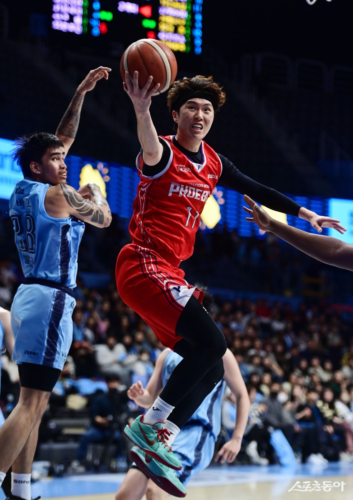 11일 고양소노아레나에서 열린 ‘2024-2025 KCC 프로농구’ 소노와 현대모비스의 경기에서 현대모비스 이우석이 소노 수비를 뚫고 슛을 하고 있다. 고양 | 주현희 기자 teth1147@donga.com