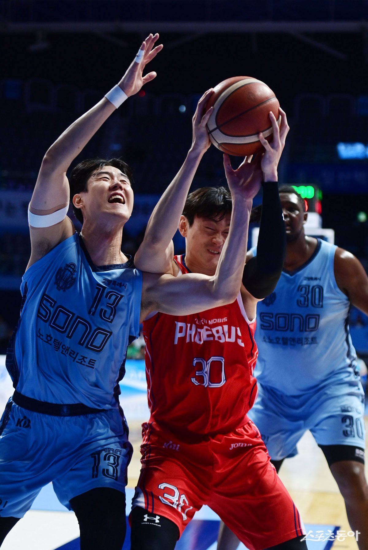 11일 고양소노아레나에서 열린 ‘2024-2025 KCC 프로농구’ 소노와 현대모비스의 경기에서 소노 임동섭과 현대모비스 김국찬이 리바운드된 볼에 손을 뻗고 있다. 고양 | 주현희 기자 teth1147@donga.com
