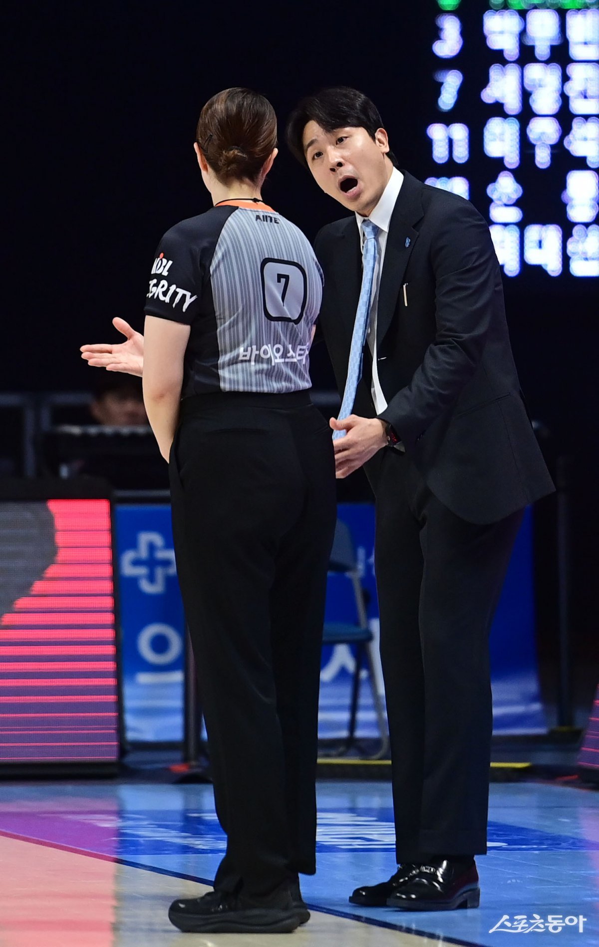 11일 고양소노아레나에서 열린 ‘2024-2025 KCC 프로농구’ 소노와 현대모비스의 경기에서 소노 김태술 감독이 심판의 판정에 어필하고 있다. 고양 | 주현희 기자 teth1147@donga.com