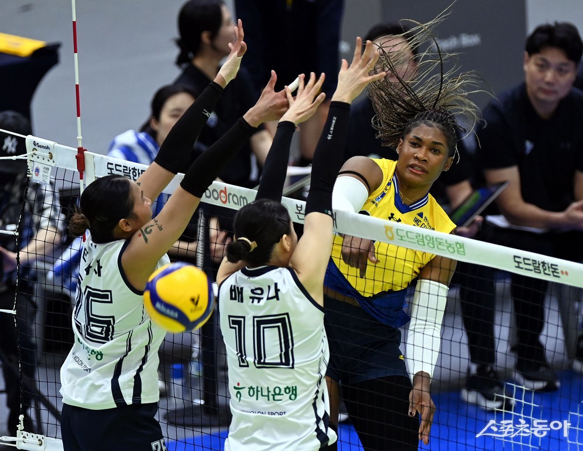 11일 경기도 수원체육관에서 ‘도드람 2024-2025 V리그’ 현대건설과 한국도로공사의 여자부 경기가 열렸다. 현대건설 모마가 한국도로공사 블로커를 피해 스파이크를 날리고 있다. 수원 | 김민성 기자 marineboy@donga.com