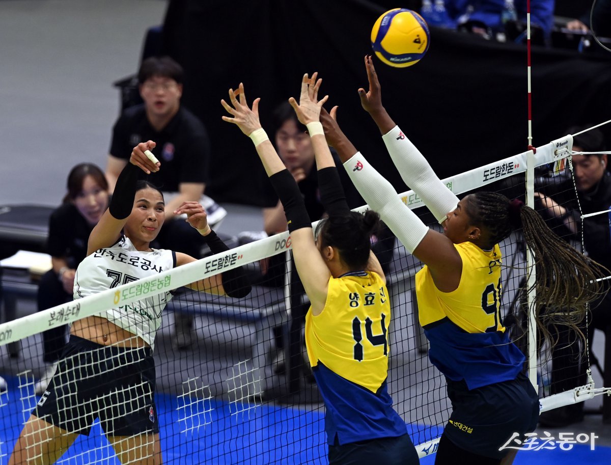11일 경기도 수원체육관에서 ‘도드람 2024-2025 V리그’ 현대건설과 한국도로공사의 여자부 경기가 열렸다. 한국도로공사 타나차가 현대건설 블로커를 피해 스파이크를 날리고 있다. 수원 | 김민성 기자 marineboy@donga.com