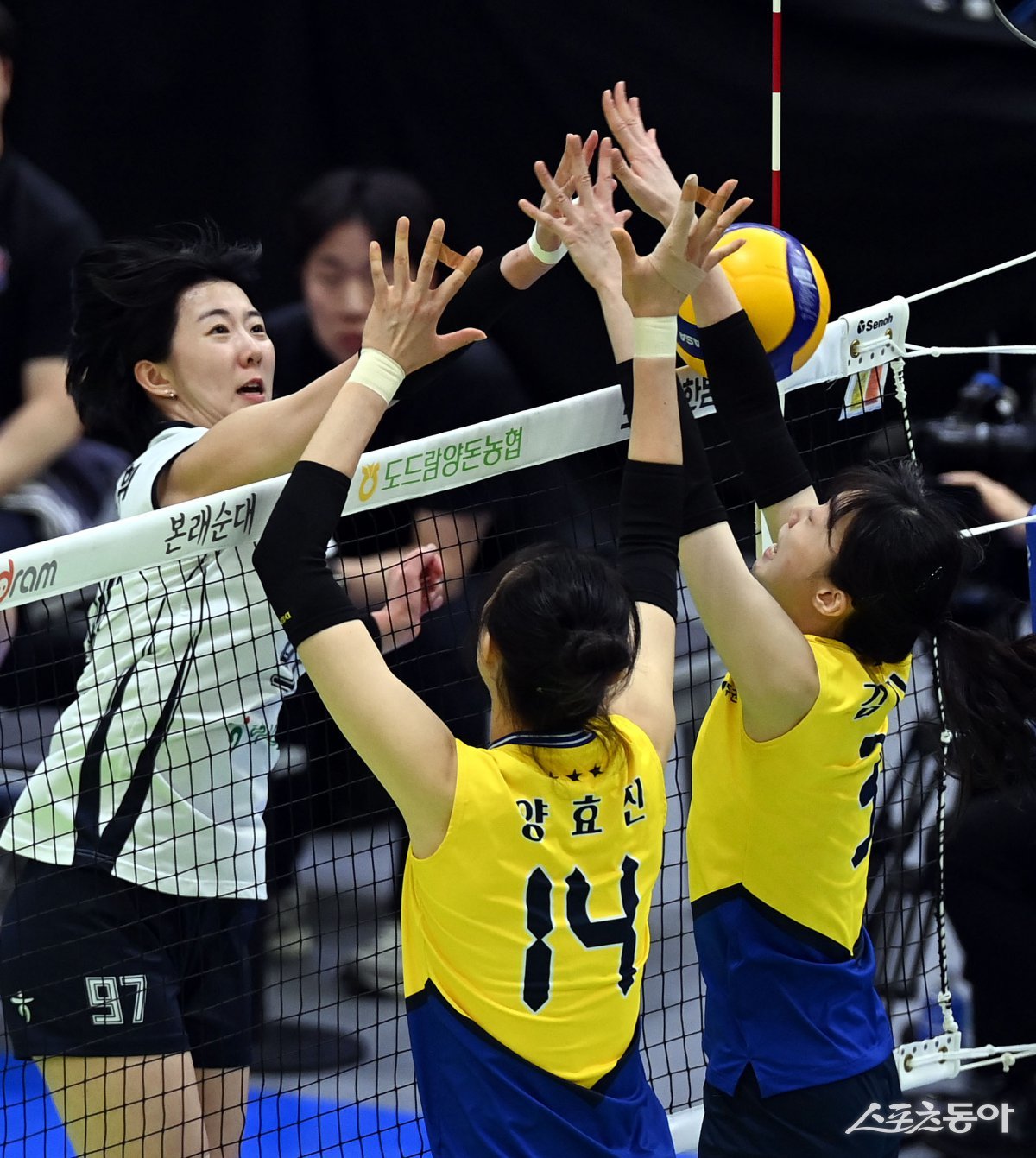 11일 경기도 수원체육관에서 ‘도드람 2024-2025 V리그’ 현대건설과 한국도로공사의 여자부 경기가 열렸다. 한국도로공사 강소휘가 현대건설 블로커를 피해 공격을 펼치고 있다. 수원 | 김민성 기자 marineboy@donga.com
