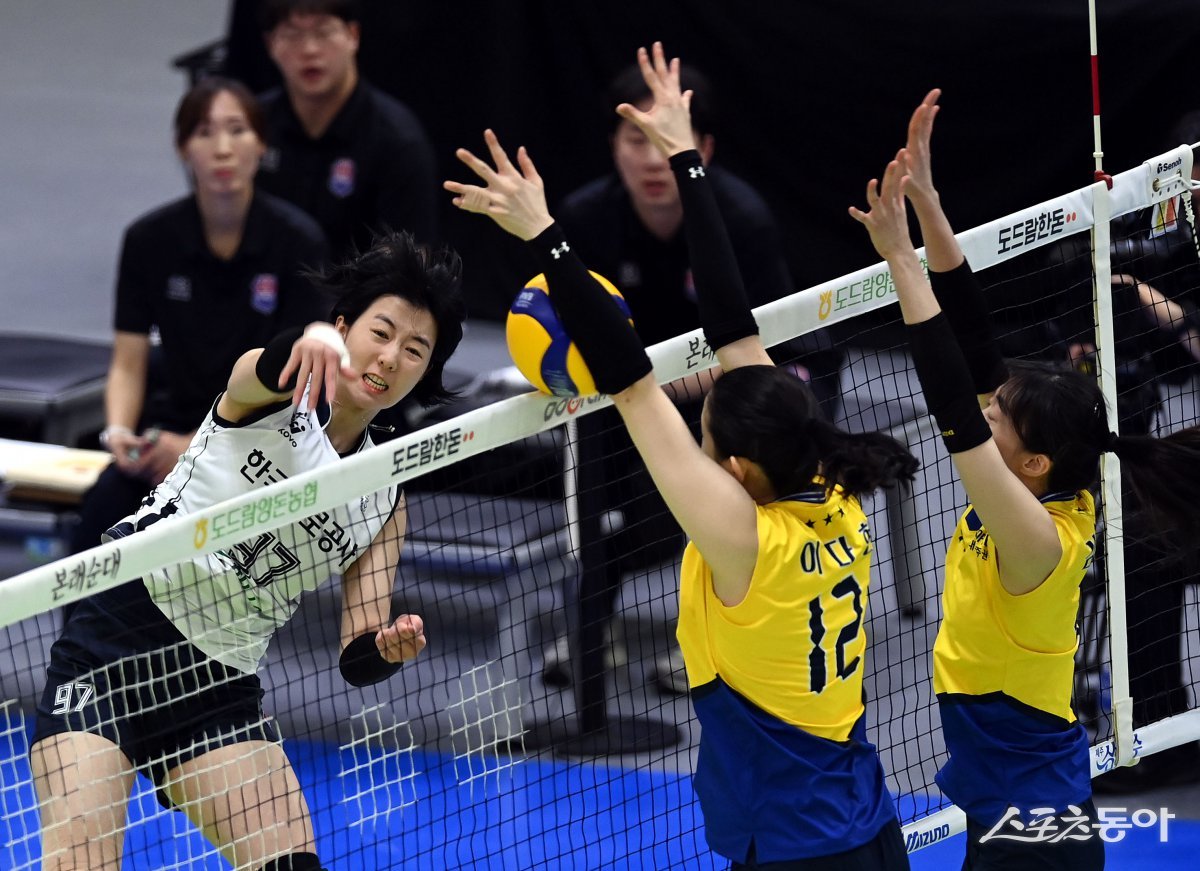 11일 경기도 수원체육관에서 ‘도드람 2024-2025 V리그’ 현대건설과 한국도로공사의 여자부 경기가 열렸다. 한국도로공사 강소휘가 현대건설 블로커를 피해 스파이크를 날리고 있다. 수원 | 김민성 기자 marineboy@donga.com