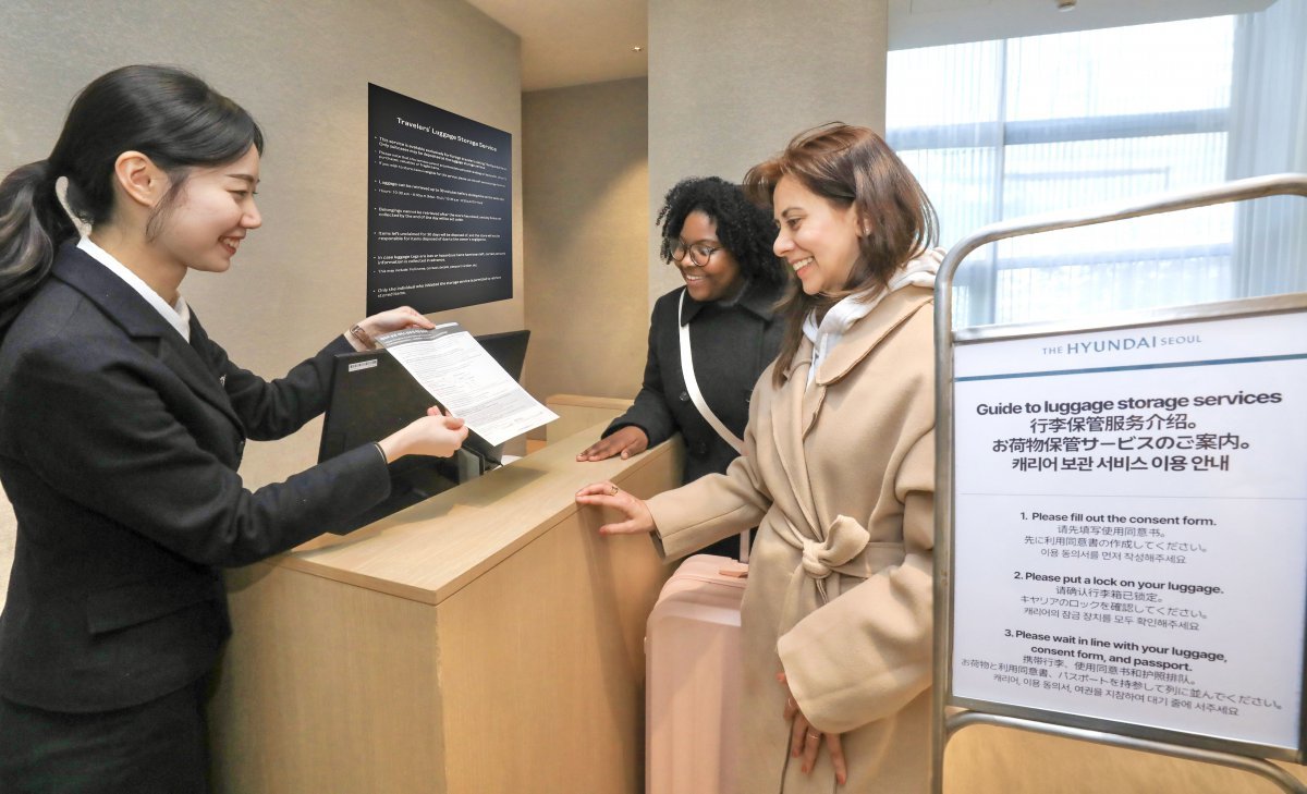 더현대 서울이 외국인 방문객 대상 서비스 강화에 한창이다. 1층 투어리스트 데스크에서 무료 캐리어 보관 서비스를 안내받고 있는 외국인 관광객. 사진제공|현대백화점