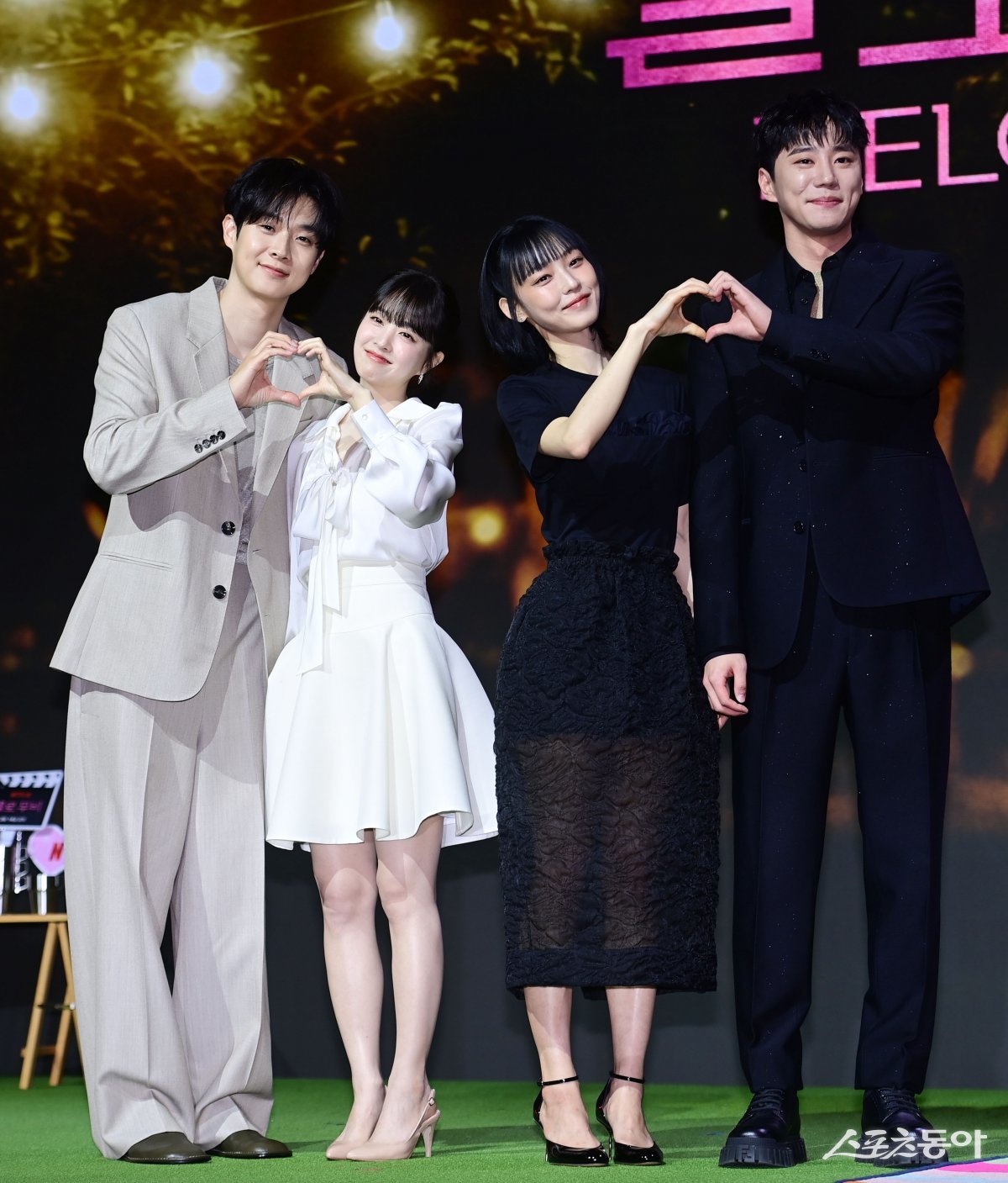 배우 최우식, 박보영, 전소니, 이준영이 12일 서울 종로구 JW메리어트동대문스퀘어서울에서 열린 넷플릭스 ‘멜로무비’ 제작발표회에서 포즈를 취하고 있다. 주현희 기자 teth1147@donga.com