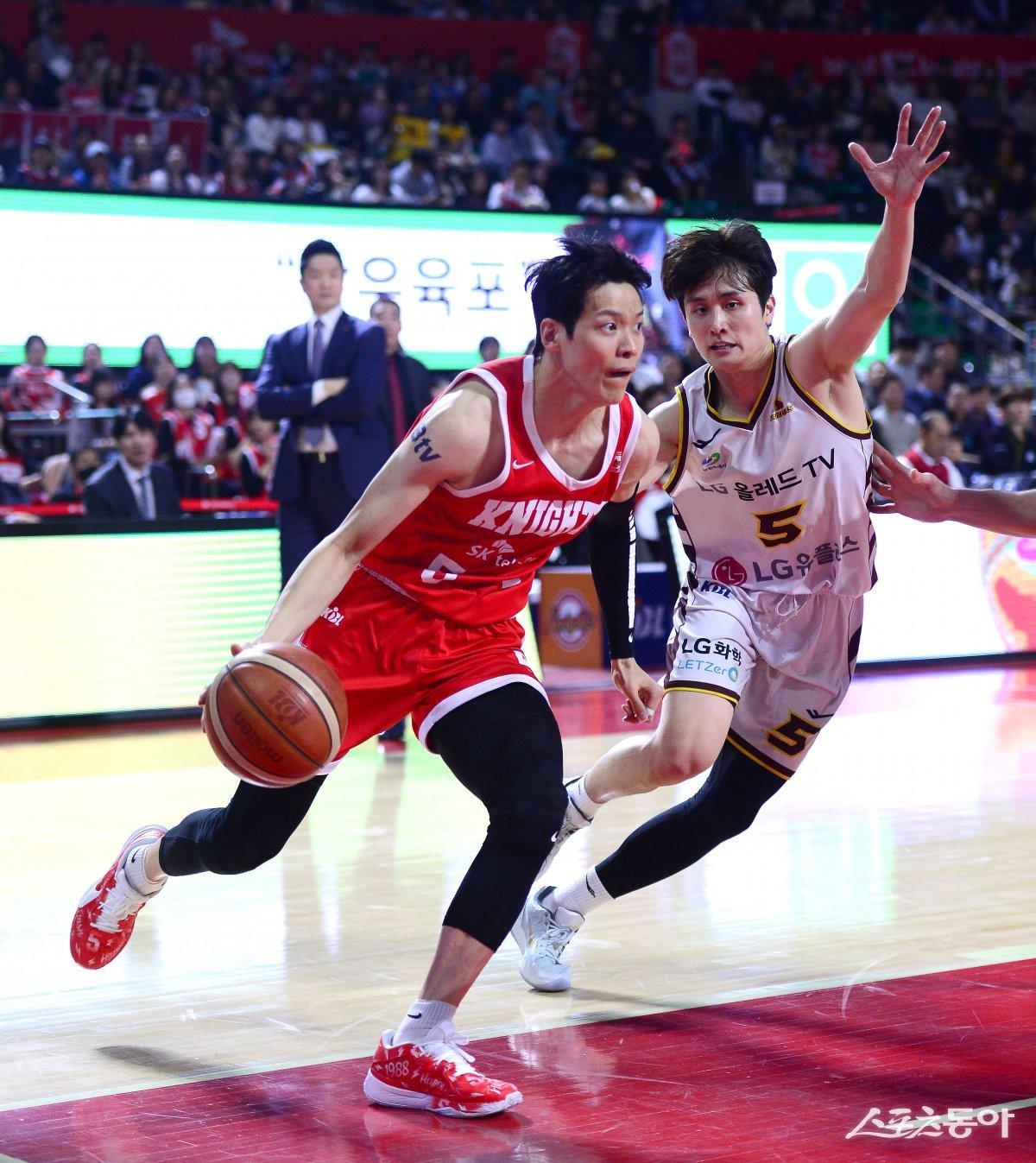 12일 서울 잠실학생체육관에서 열린 ‘2024-2025 프로농구’ SK와 LG 경기에서 SK 김선형이 LG의 수비를 뚫고 골밑을 공격하고 있다. 잠실|김종원 기자 won@donga.com