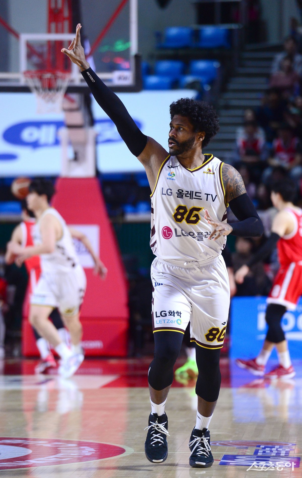 12일 서울 잠실학생체육관에서 열린 ‘2024-2025 프로농구’ SK와 LG 경기에서 LG 먼로가 3점슛을 성공시킨 후 기뻐하고 있다. 잠실|김종원 기자 won@donga.com