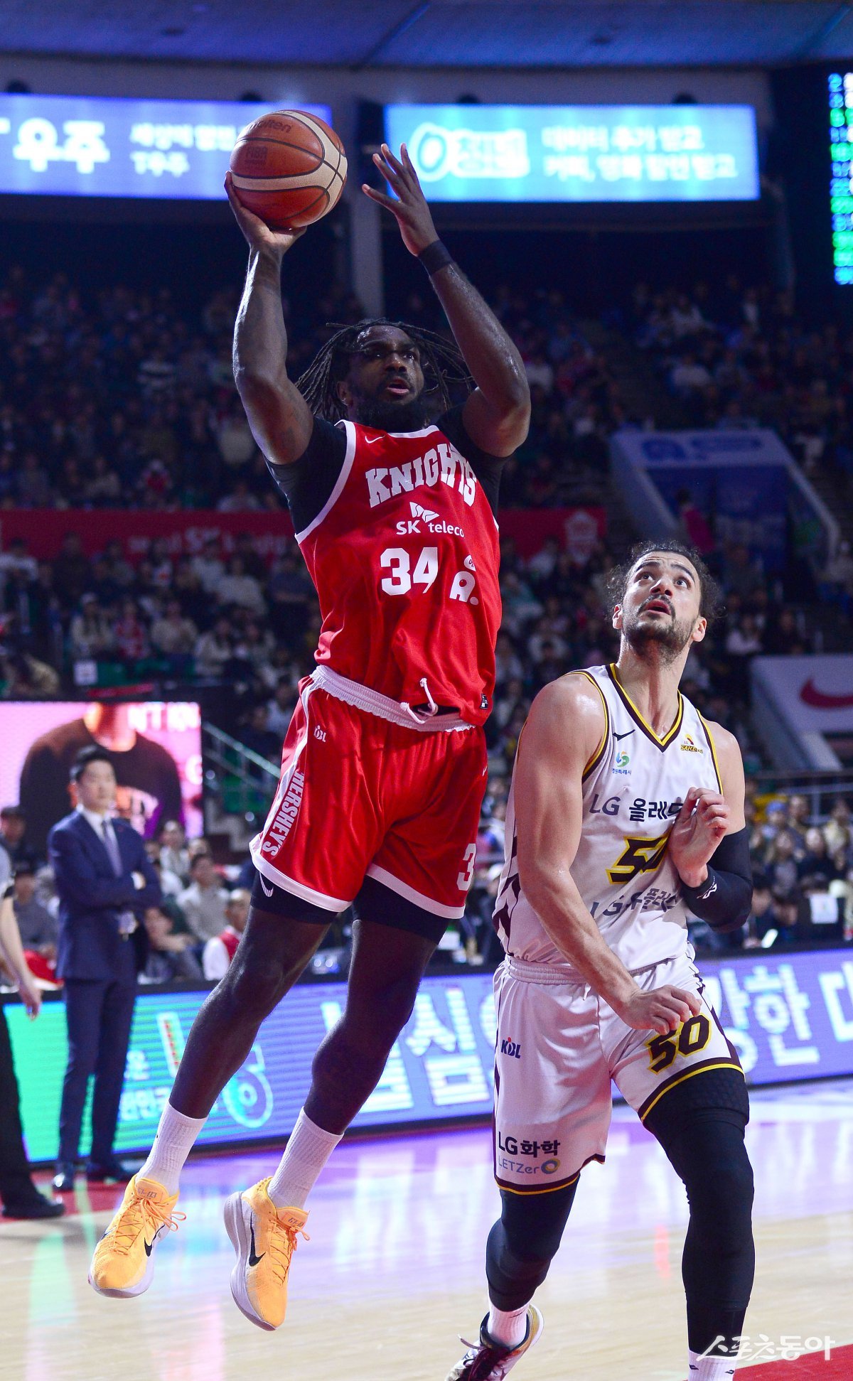 12일 서울 잠실학생체육관에서 열린 ‘2024-2025 프로농구’ SK와 LG 경기에서 SK 워니가 LG의 수비를 뚫고 골밑 슛을 하고 있다. 잠실|김종원 기자 won@donga.com