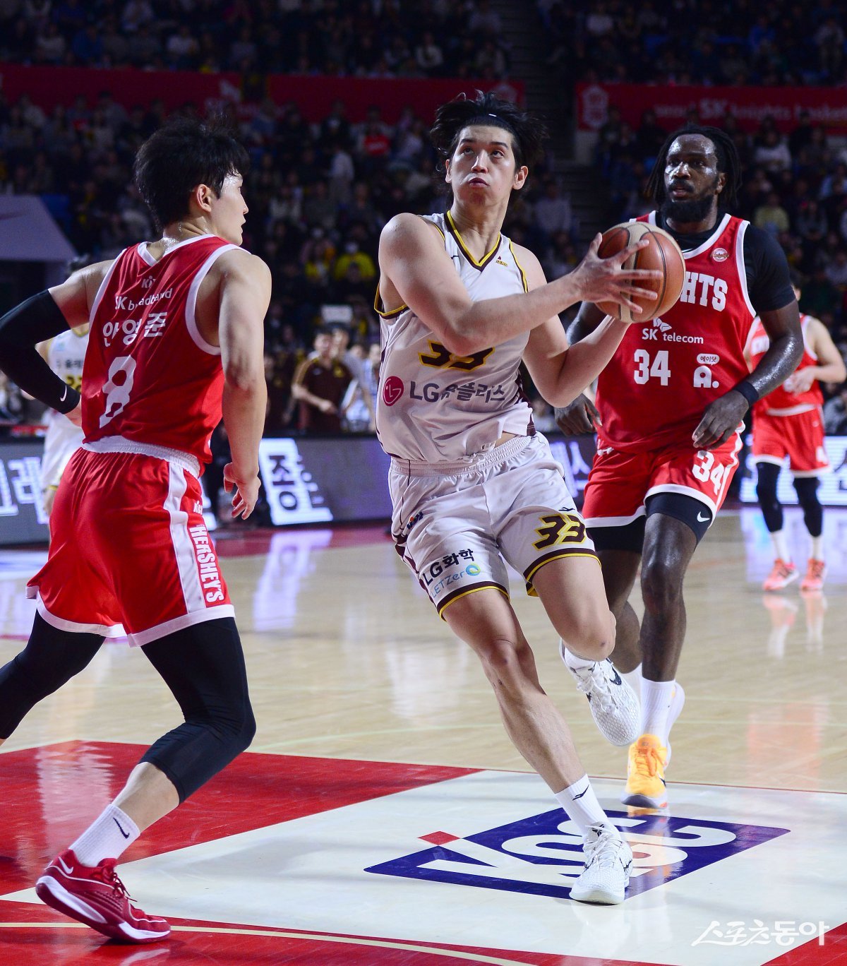 12일 서울 잠실학생체육관에서 열린 ‘2024-2025 프로농구’ SK와 LG 경기에서 LG 타마요가 SK의 수비를 뚫고 골밑을 공격하고 있다. 잠실|김종원 기자 won@donga.com