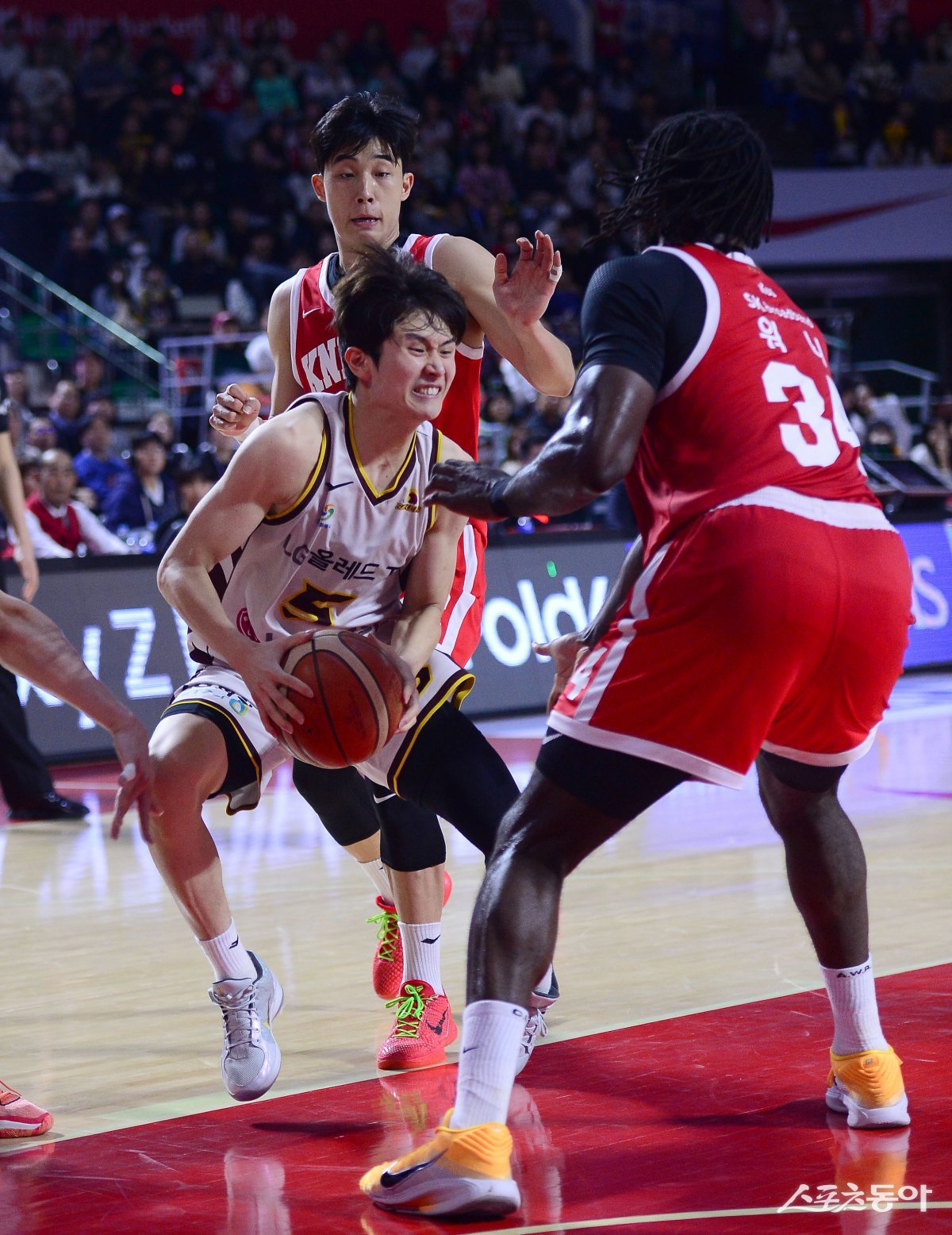 12일 서울 잠실학생체육관에서 열린 ‘2024-2025 프로농구’ SK와 LG 경기에서 LG 양준석이 SK의 수비를 뚫고 골밑을 공격하고 있다. 잠실|김종원 기자 won@donga.com