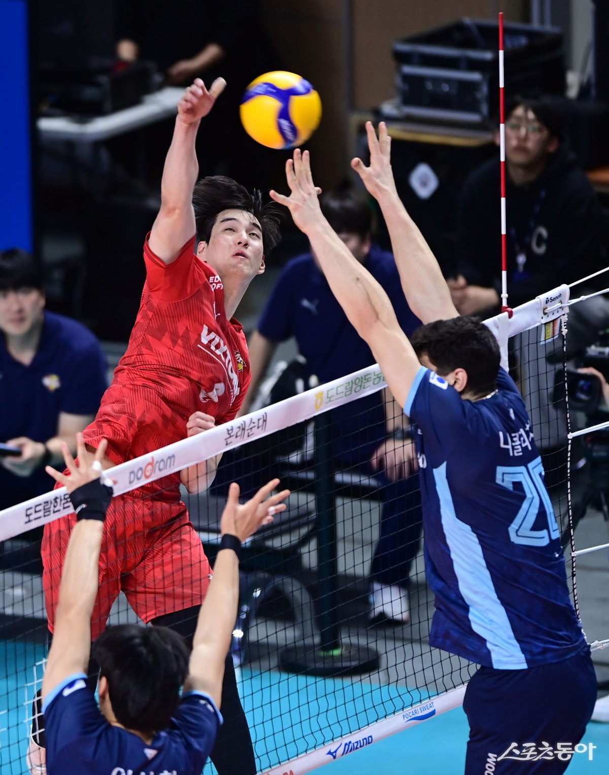 12일 서울 장충체육관에서 열린 ‘도드람 2024-2025 V리그’ 남자부 우리카드와 한국전력의 경기에서 한국전력 임성진이 우리카드 블로커 앞에서 스파이크를 하고 있다. 장충 | 주현희 기자 teth1147@donga.com