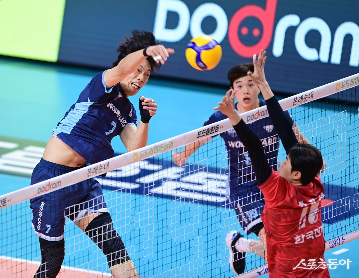 12일 서울 장충체육관에서 열린 ‘도드람 2024-2025 V리그’ 남자부 우리카드와 한국전력의 경기에서 우리카드 이상현이 한국전력 블로커 앞에서 스파이크를 하고 있다. 장충 | 주현희 기자 teth1147@donga.com