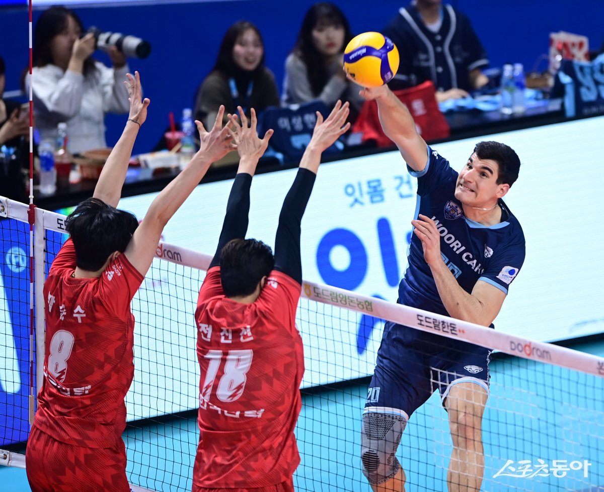 12일 서울 장충체육관에서 열린 ‘도드람 2024-2025 V리그’ 남자부 우리카드와 한국전력의 경기에서 우리카드 니콜리치가 한국전력 블로커 앞에서 스파이크를 하고 있다. 장충 | 주현희 기자 teth1147@donga.com