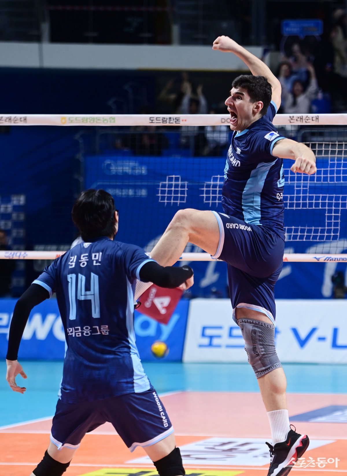 12일 서울 장충체육관에서 열린 ‘도드람 2024-2025 V리그’ 남자부 우리카드와 한국전력의 경기에서 세트스코어 3-1로 승리한 우리카드 니콜리치가 기뻐하고 있다. 장충 | 주현희 기자 teth1147@donga.com