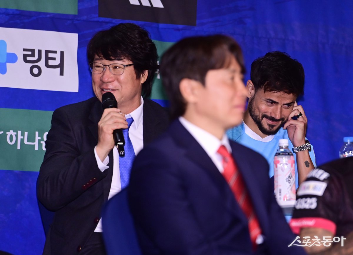 13일 서울 서대문구 홍은동 스위스그랜드호텔에서 열린 ‘K리그 1 2025 개막 미디어데이’에서 대구FC 박창현 감독이 취재진의 질문에 세징야를 칭찬하고 있다. 주현희 기자 teth1147@donga.com