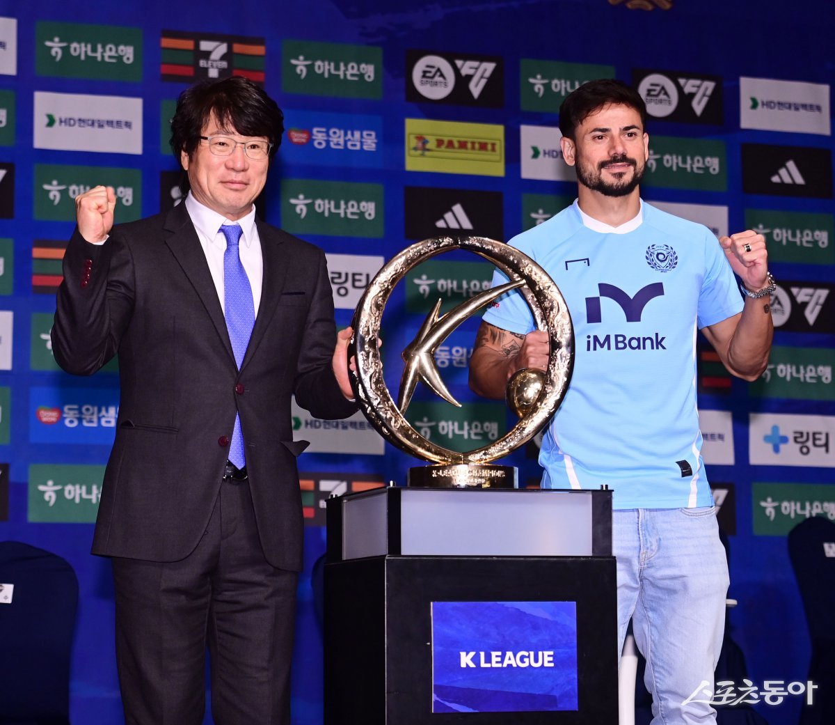 13일 서울 서대문구 홍은동 스위스그랜드호텔에서 열린 ‘K리그 1 2025 개막 미디어데이’에서 대구FC 박창현 감독, 세징야가 기념 촬영을 하고 있다. 주현희 기자 teth1147@donga.com