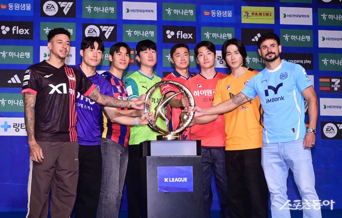FC서울 린가드, FC안양 이창용, 수원FC 이용, 대전 하나 이창근, 김천 상무 김민덕, 강원FC 김동현, 제주SK FC 김주공, 대구FC 세징야가 13일 서울 서대문구 홍은동 스위스그랜드호텔에서 열린 ‘K리그 1 2025 개막 미디어데이’에서 주현희 기자 teth1147@donga.com