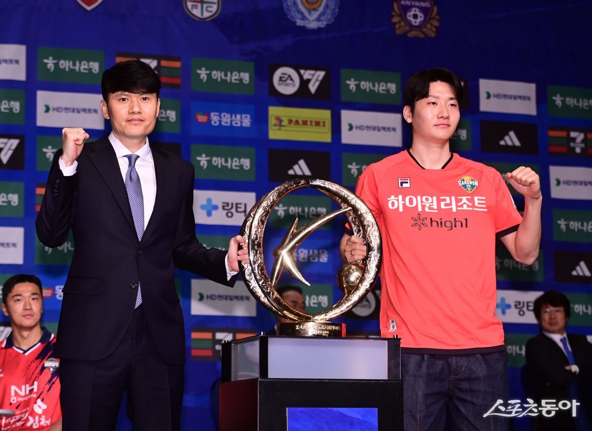 13일 서울 서대문구 홍은동 스위스그랜드호텔에서 열린 ‘K리그 1 2025 개막 미디어데이’에서 강원FC 정경호 감독, 김동현이 기념 촬영을 하고 있다. 주현희 기자 teth1147@donga.com