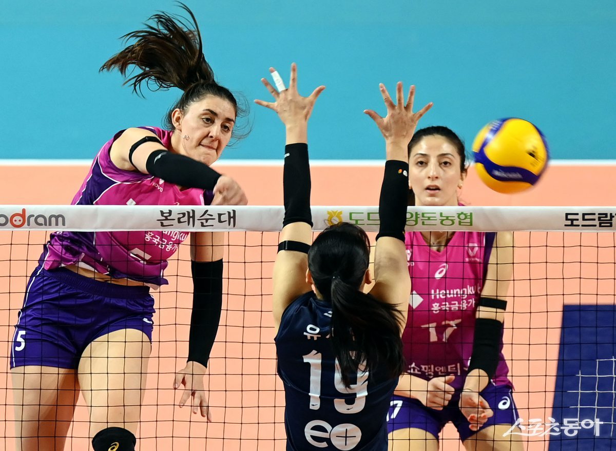 13일 인천 삼산월드체육관에서 ‘도드람 2024-2025 V리그’ 흥국생명과 GS칼텍스의 여자부 경기가 열렸다. 흥국생명 피치가 GS칼텍스 블로커를 피해 스파이크를 날리고 있다. 인천 | 김민성 기자 marineboy@donga.com
