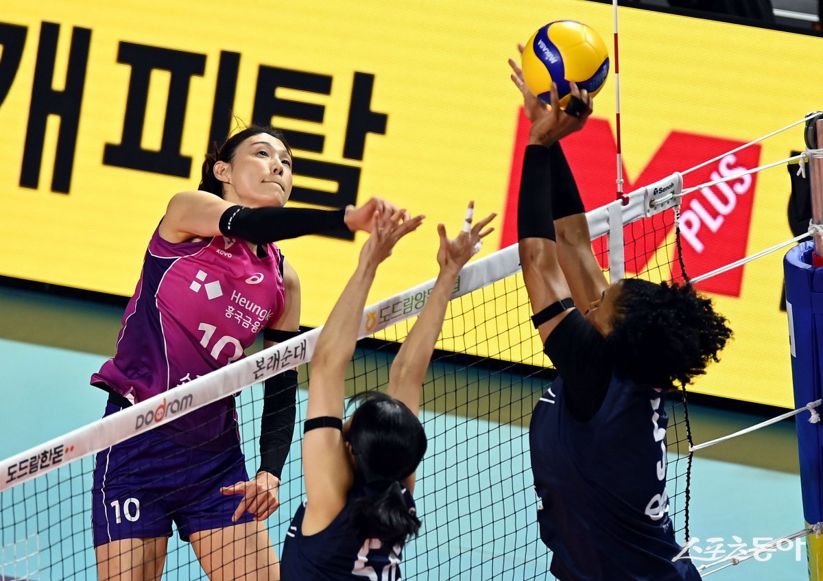 13일 인천 삼산월드체육관에서 ‘도드람 2024-2025 V리그’ 흥국생명과 GS칼텍스의 여자부 경기가 열렸다. 흥국생명 김연경이 GS칼텍스 블로커를 피해 스파이크를 날리고 있다. 인천 | 김민성 기자 marineboy@donga.com