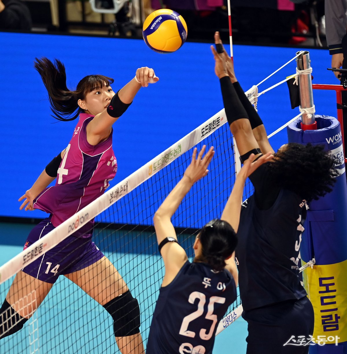 13일 인천 삼산월드체육관에서 ‘도드람 2024-2025 V리그’ 흥국생명과 GS칼텍스의 여자부 경기가 열렸다. 흥국생명 정윤주가 GS칼텍스 블로커를 피해 공격을 펼치고 있다. 인천 | 김민성 기자 marineboy@donga.com