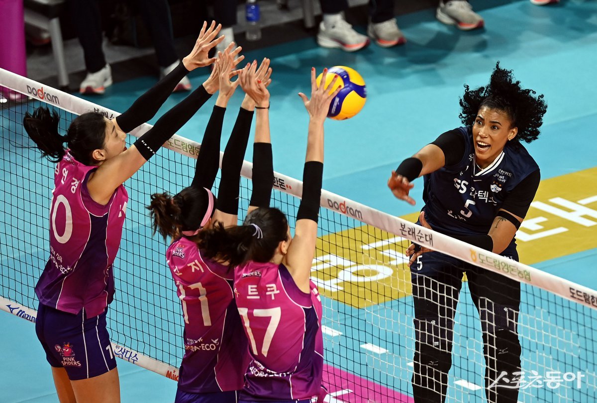 13일 인천 삼산월드체육관에서 ‘도드람 2024-2025 V리그’ 흥국생명과 GS칼텍스의 여자부 경기가 열렸다. GS칼텍스 실바가 흥국생명 블로커를 피해 스파이크를 날리고 있다. 인천 | 김민성 기자 marineboy@donga.com