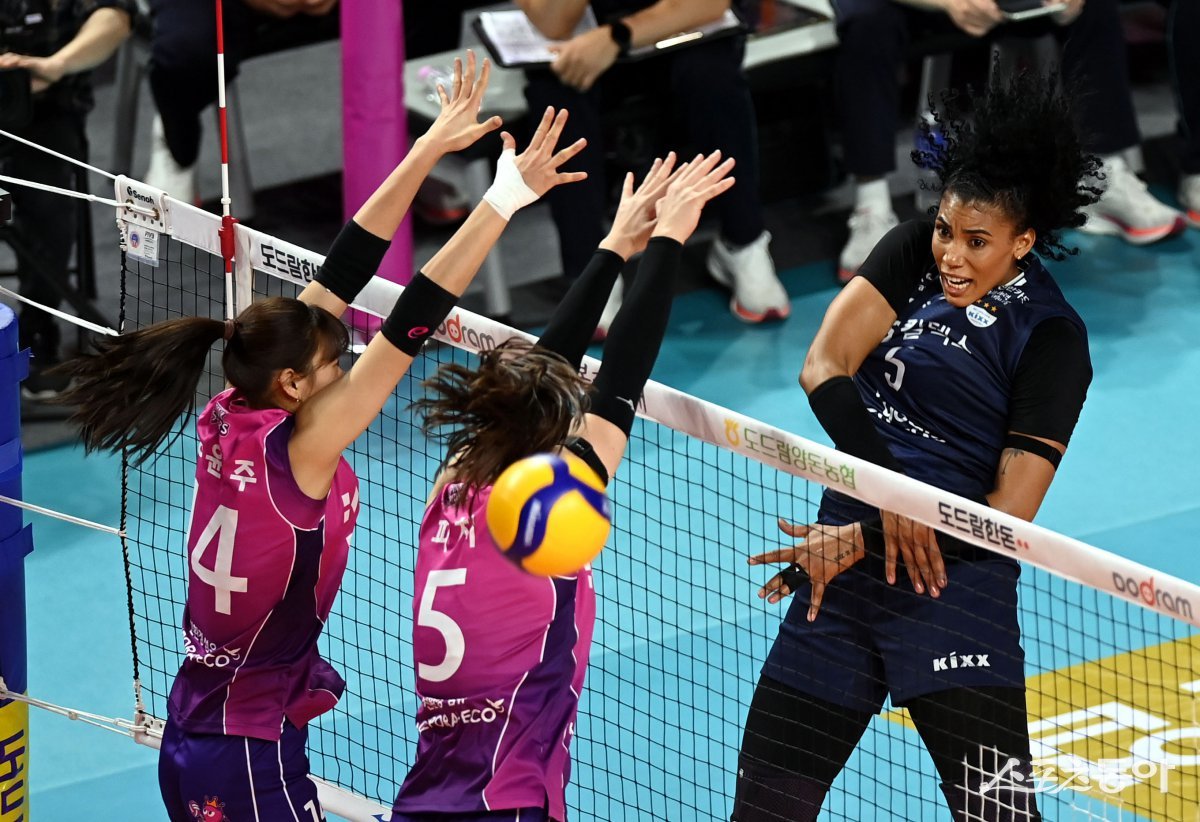 13일 인천 삼산월드체육관에서 ‘도드람 2024-2025 V리그’ 흥국생명과 GS칼텍스의 여자부 경기가 열렸다. GS칼텍스 실바가 흥국생명 블로커를 피해 스파이크를 날리고 있다. 인천 | 김민성 기자 marineboy@donga.com