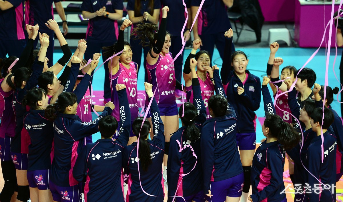 13일 인천 삼산월드체육관에서 ‘도드람 2024-2025 V리그’ 흥국생명과 GS칼텍스의 여자부 경기가 열렸다. 흥국생명이 GS칼텍스를 상대로 세트스코어 3-1 승리 후 선수들이 코트에서 기쁨을 나누고 있다. 인천 | 김민성 기자 marineboy@donga.com
