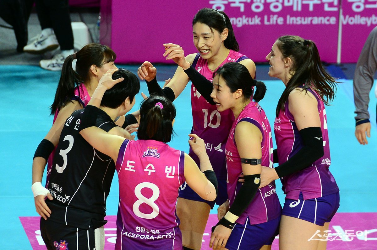 13일 인천 삼산월드체육관에서 ‘도드람 2024-2025 V리그’ 흥국생명과 GS칼텍스의 여자부 경기가 열렸다. 흥국생명이 GS칼텍스를 상대로 세트스코어 3-1 승리 후 선수들이 코트에서 기쁨을 나누고 있다. 인천 | 김민성 기자 marineboy@donga.com
