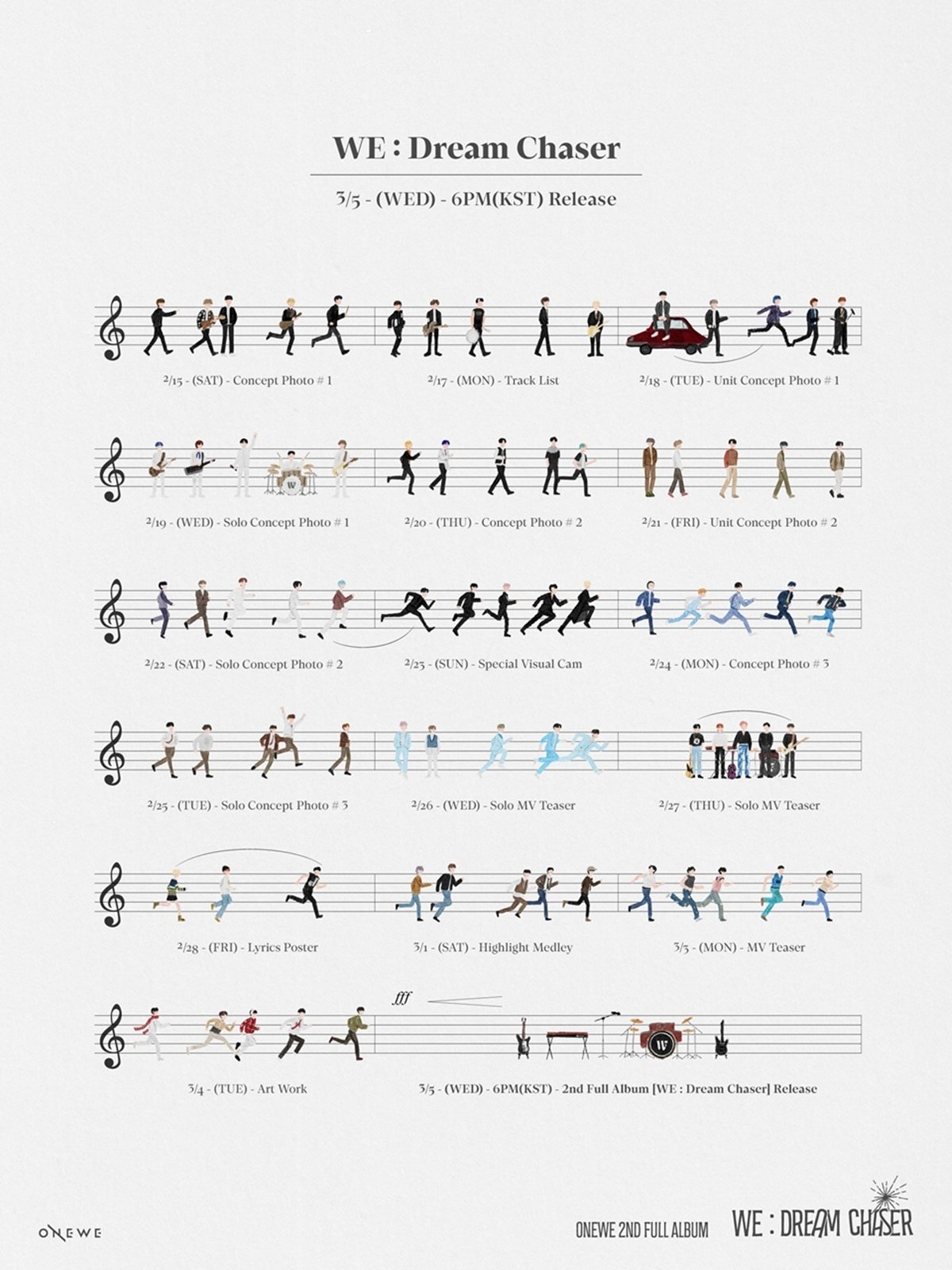 스케줄 플랜 이미지는 악보 형식으로 제작돼 눈길을 끈다. 오선지에는 데뷔부터 지금까지 원위의 모습을 음표로 형상화해 일러스트로 담았다. ‘꿈을 좇는 사람들’이라는 앨범 타이틀에 걸맞게, 앞을 향해 달려가는 모습으로 의미를 더했다. ‘WE : Dream Chaser’ 발매 당일에는 원위의 포지션 악기가 그려져 있어 눈길을 끈다.
