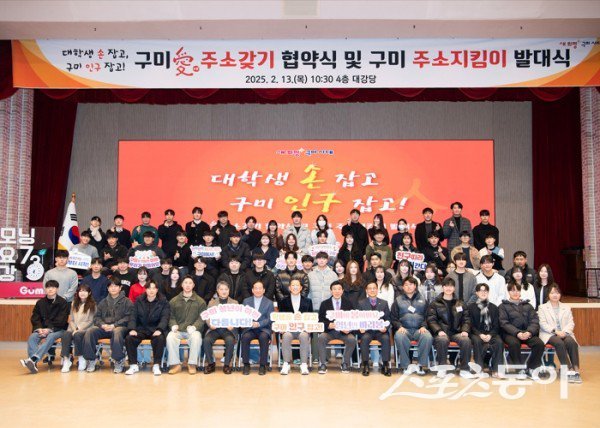 청년 전입 확산기에 성공적으로 진입하기 위해 13일 시청 대강당에서 ‘구미愛 주소갖기 협약식’과 ‘구미 주소지킴이 발대식’이 열렸다. 행사에는 국립금오공과대학교, 경운대학교, 구미대학교, 한국폴리텍대학 구미캠퍼스 등 지역 내 4개 대학 총장 및 학장, 대학생 주소지킴이 80명이 참석했다.