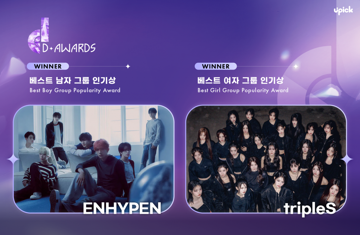 제1회 디 어워즈(D Awards) 유픽 인기상 마지막 라운드 ‘베스트 남녀 그룹’ 수상 팀이 13일 오후 3시 결정됐다. 그룹 엔하이픈과 트리플에스다.