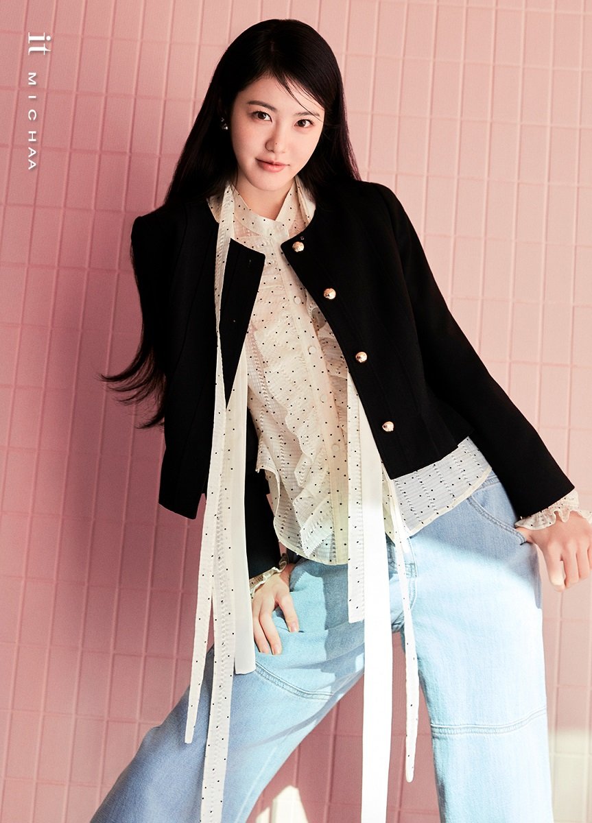 먼저 로맨틱한 무드가 돋보이는 핑크톤의 화보에서는 귀여운 러플 블라우스에 포멀한 블랙 재킷, 라이트한 블루컬러의 진을 매치한 스타일링을 제안했다. 봄 햇살처럼 따사로운 느낌의 화보에서는 봄 시즌을 여는 달콤한 분위기를 표현했다. 소프트 베이지 컬러의 스웨이드 자켓과 스커트를 셋업으로 착용, 부드러운 텍스쳐와 톤온톤 스타일링의 매력을 한껏 보여줬다.