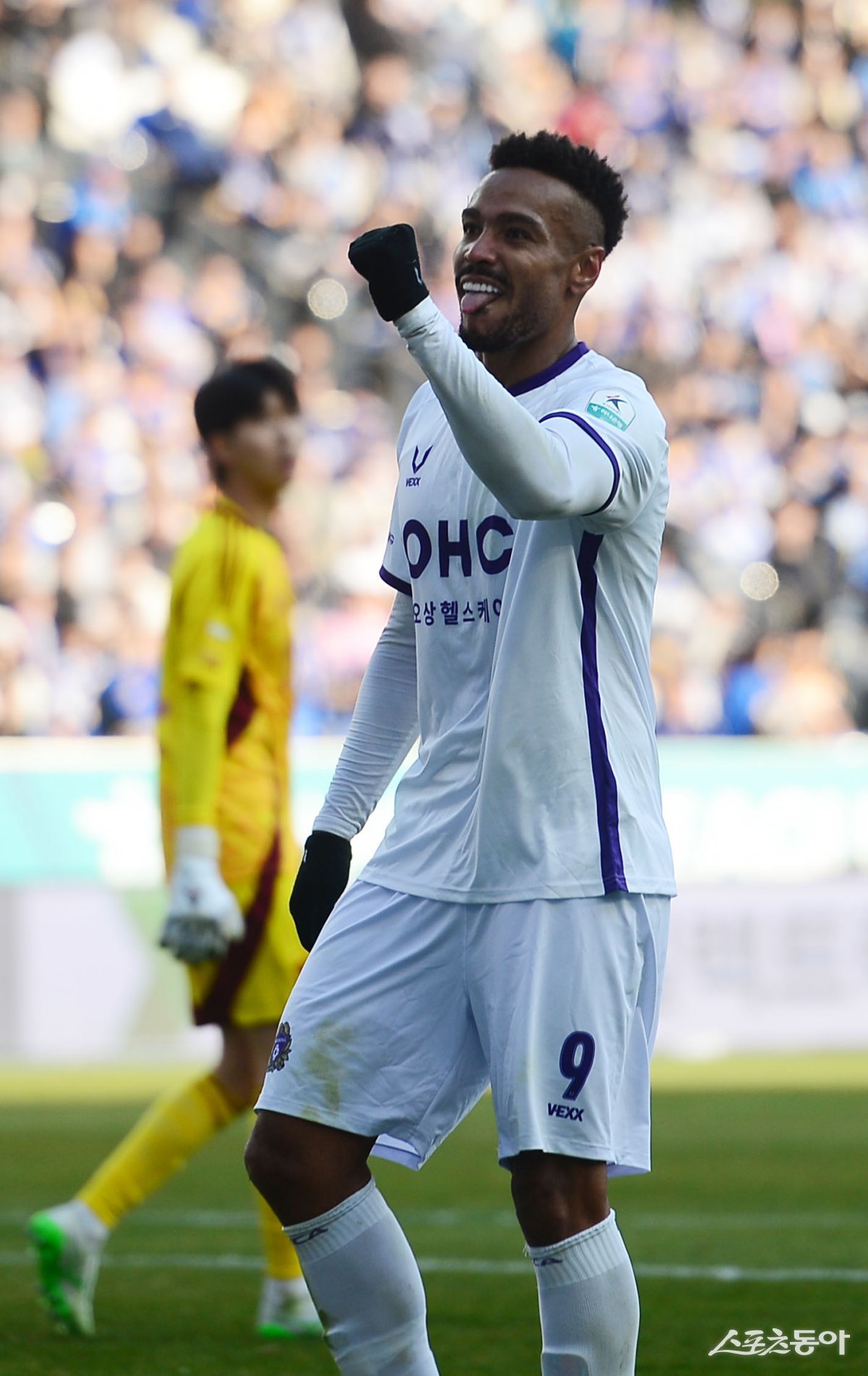16일 울산문수축구경기장에서 열린 ‘하나은행 K리그1 2025’ 울산 HD FC와 FC안양의 경기에서 안양 모따가 결승골을 성공시킨 후 세리머니를 하고 있다. 울산 | 주현희 기자 teth1147@donga.com