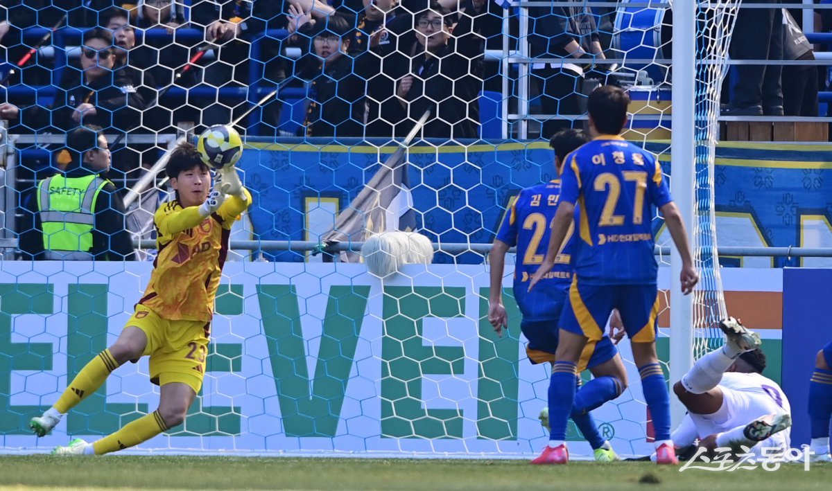 16일 울산문수축구경기장에서 열린 ‘하나은행 K리그1 2025’ 울산 HD FC와 FC안양의 경기에서 울산 문정인이 슈팅을 막고 있다. 울산 | 주현희 기자 teth1147@donga.com