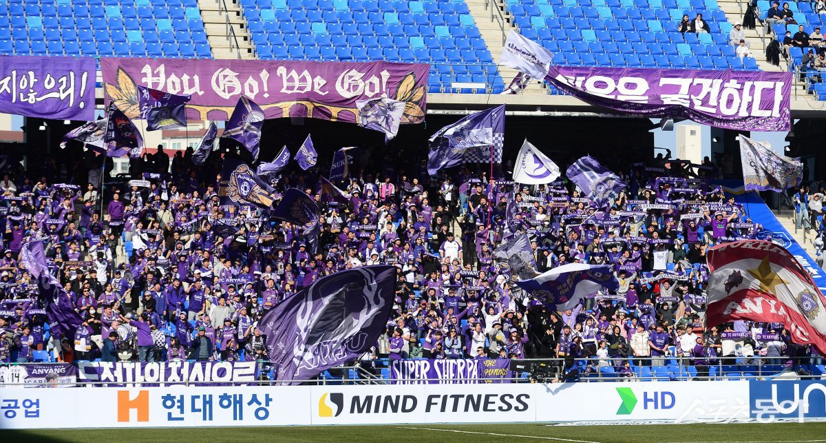 16일 울산문수축구경기장에서 열린 ‘하나은행 K리그1 2025’ 울산 HD FC와 FC안양의 경기에서 안양 팬들이 응원을 하고 있다. 울산 | 주현희 기자 teth1147@donga.com