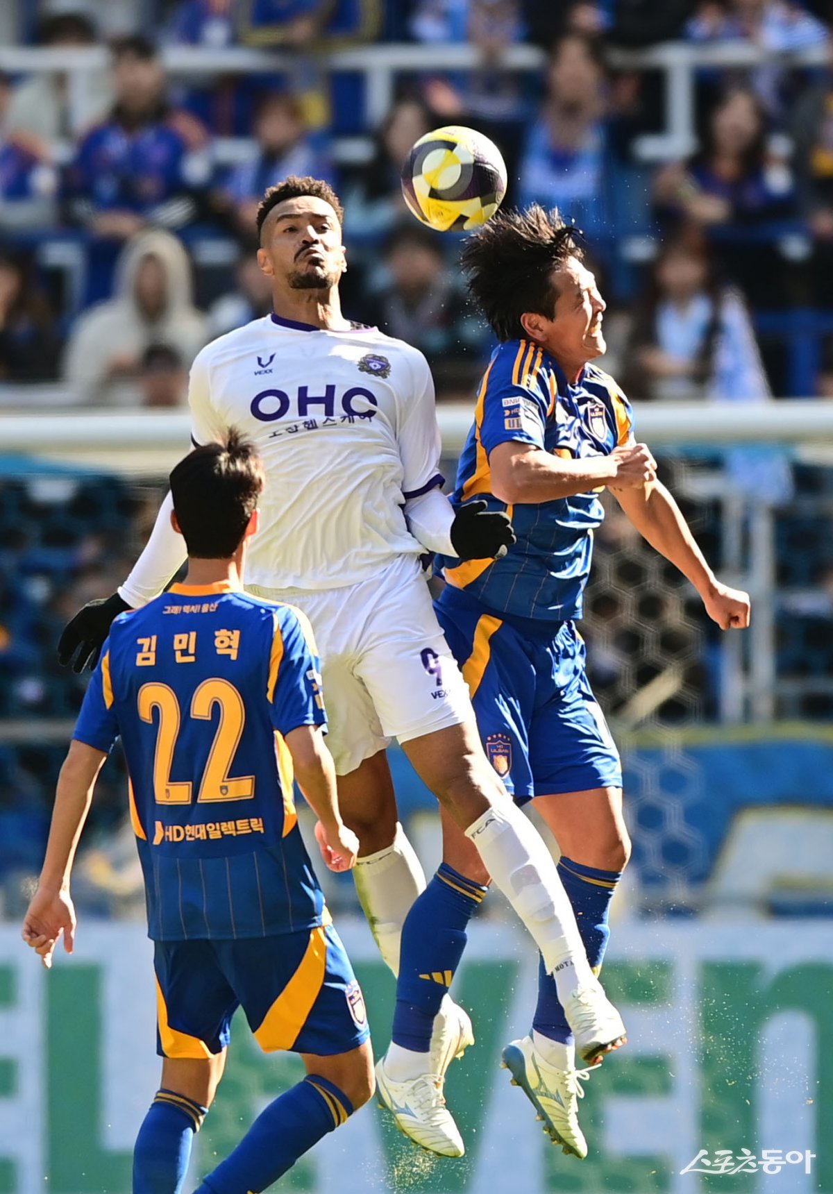 16일 울산문수축구경기장에서 열린 ‘하나은행 K리그1 2025’ 울산 HD FC와 FC안양의 경기에서 안양 모따와 울산 김영권이 헤딩 경합을 하고 있다. 울산 | 주현희 기자 teth1147@donga.com