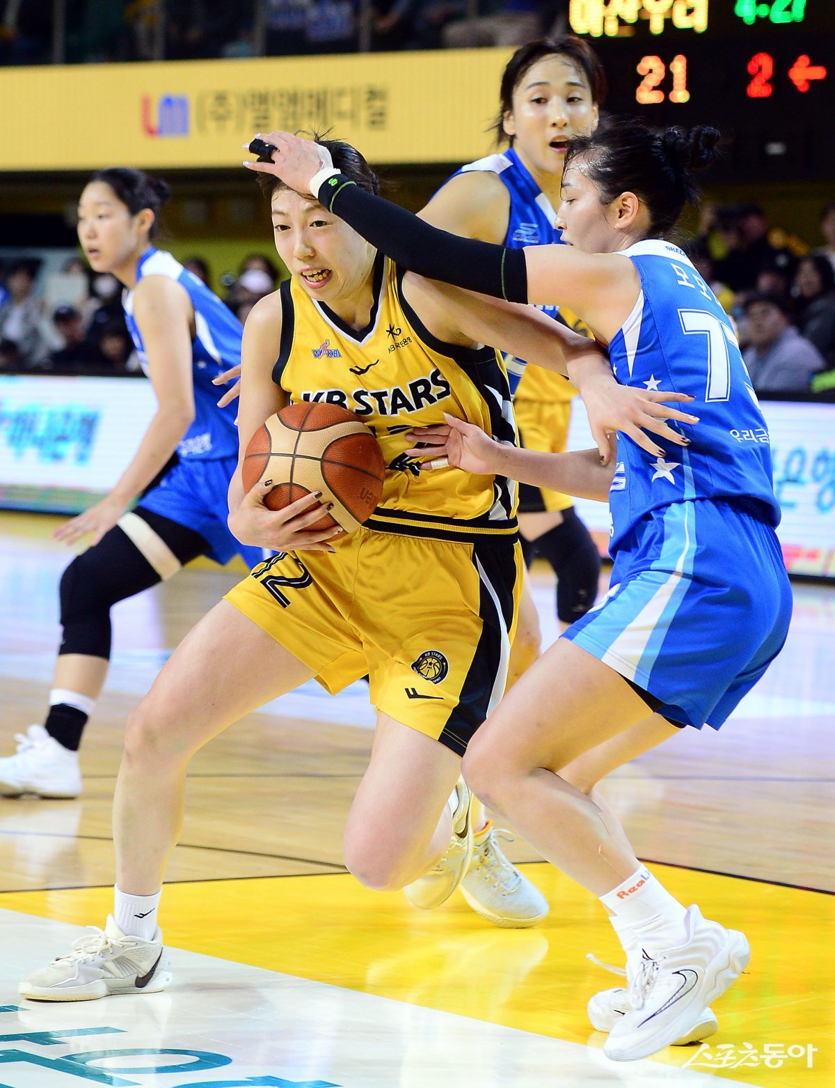 16일 충북 청주체육관에서 열린 ‘하나은행 2024-2025 여자프로농구’ KB와 우리은행의 경기에서 KB 나가타 모에가 우리은행 모모나의 수비를 피해 슛을 시도하고 있다. 청주 | 김민성 기자 marineboy@donga.com