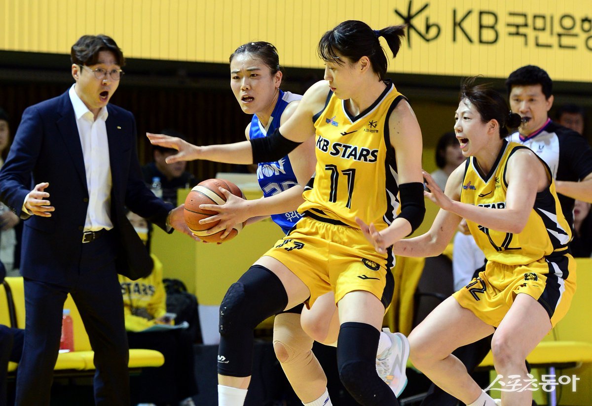 16일 충북 청주체육관에서 열린 ‘하나은행 2024-2025 여자프로농구’ KB와 우리은행의 경기에서 우리은행 이명관이 KB 강이슬의 수비를 피해 돌파하고 있다. 청주 | 김민성 기자 marineboy@donga.com