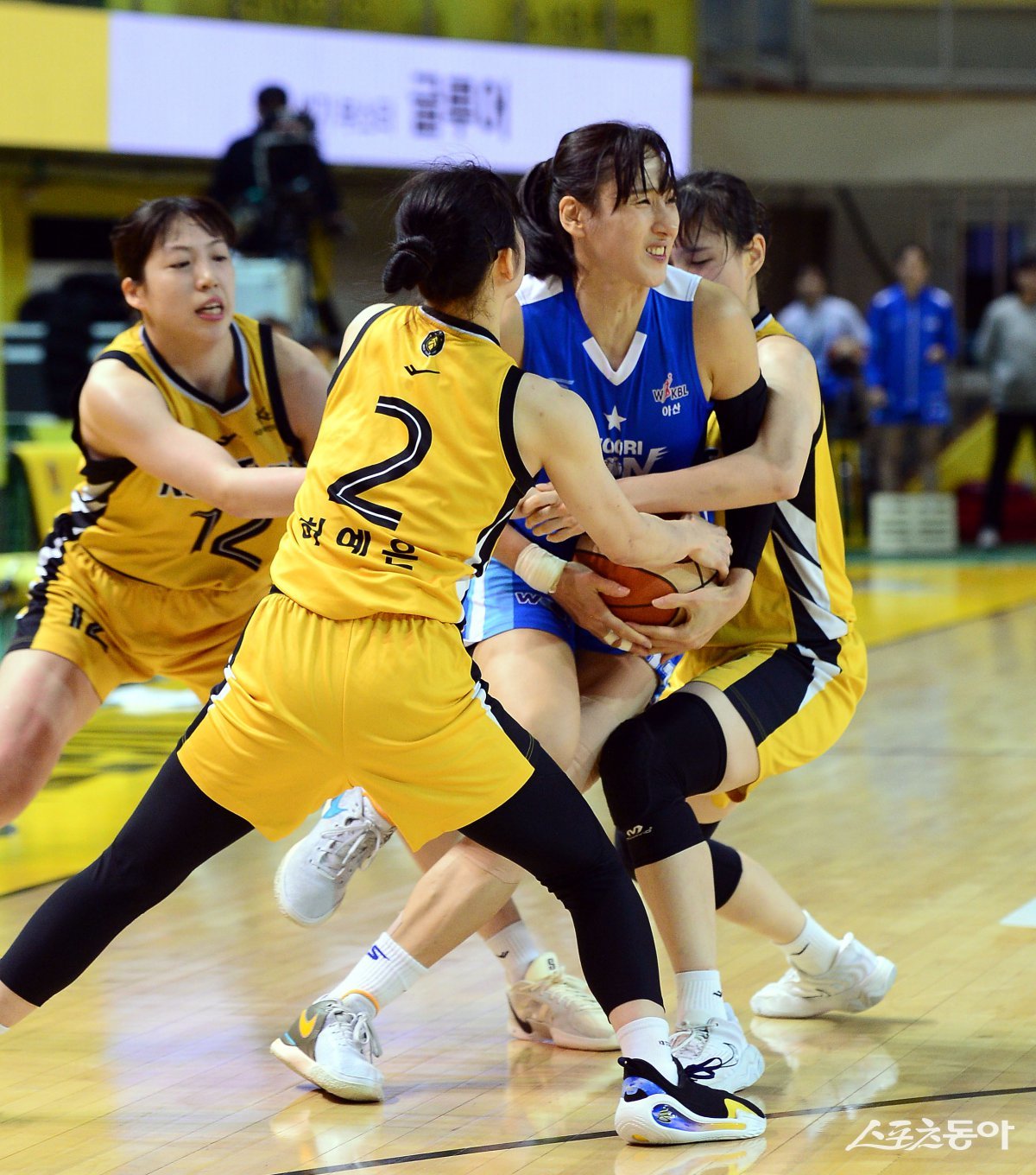 16일 충북 청주체육관에서 열린 ‘하나은행 2024-2025 여자프로농구’ KB와 우리은행의 경기에서 우리은행 김단비가 KB 수비에 막혀 돌파를 시도하고 있다. 청주 | 김민성 기자 marineboy@donga.com